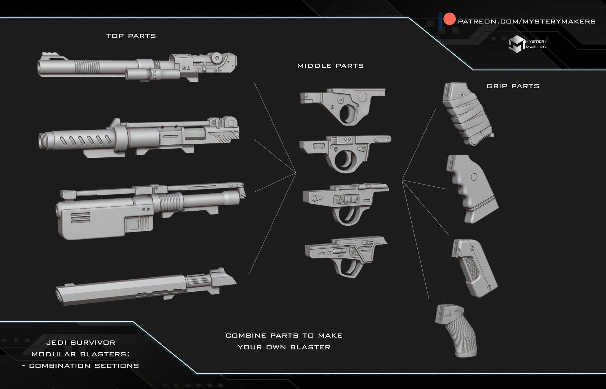 There are currently 7 blasters available.... but there will be more added to this in the future. This gives 21 different parts to choose from giving over 1000+ combinations.